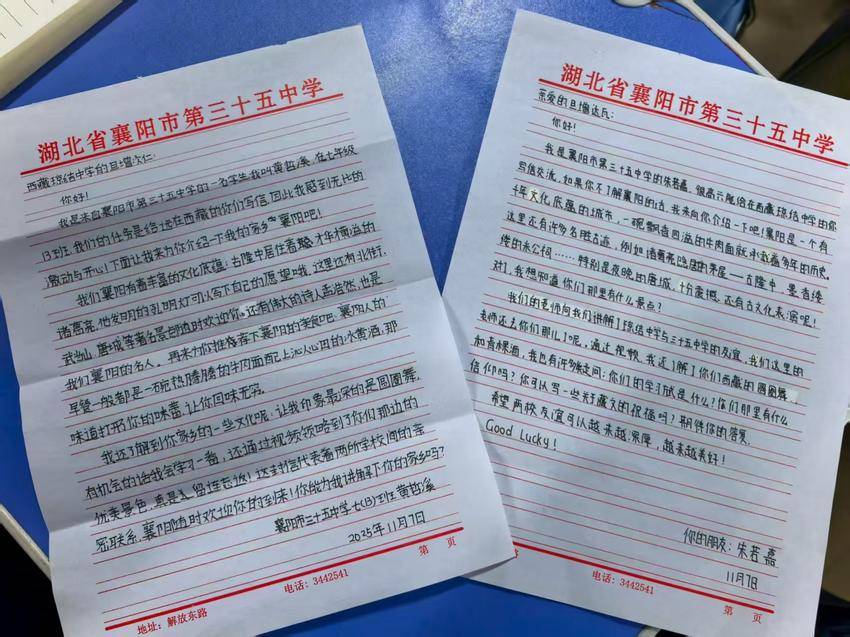 本网讯(通讯员王奇君、王娟)为深化汉藏两地学子交往交流交融,延续襄阳对口援藏30周年深厚情谊,近日,全国民族团结进步模范集体——襄阳市第三十五中学以书信为纽带,面向七年级全体学生与西藏琼结县结对学校,开展“一封书信一份情 中华民族一家亲”民族团结书信活动,让铸牢中华民族共同体意识在青少年心中落地生根。