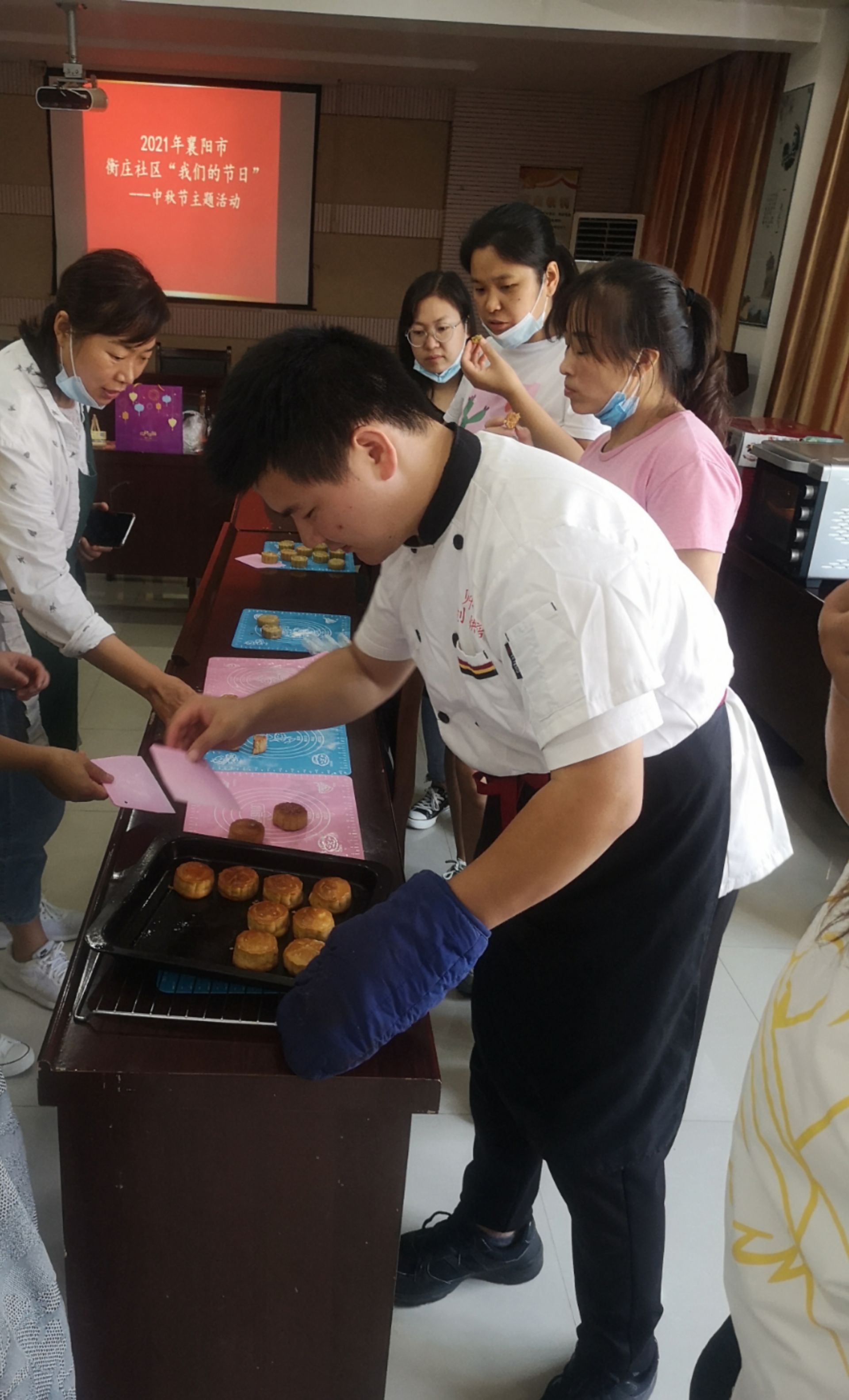 志愿者们和工作人员一起来到社区新时代文明实践站,在专业老师的指导下制作月饼,揉面、包馅、揉圆压扁,再压模……想到最后要把月饼送给社区弱势群体,大家都做的格外用心。不一会儿,纯手工制作的月饼就新鲜出炉、飘香四溢了。大家一边拉家常,一边包装月饼,谈谈中秋的传说,聊聊各地不同的中秋风俗,活动现场其乐融融。