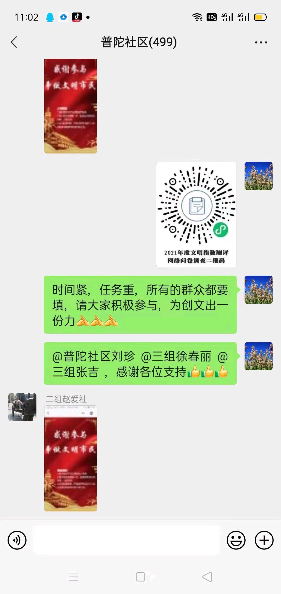 社区居民毫不含糊,积极参与纷纷回复提交完成的截图。感谢参与,争做文明市民!这不仅仅是一次参与问卷调查,更是把社区居民的心紧密团结在一起,大家热情高涨,凝聚力更强,为创文出力,拉进了干部与群众之间的距离。