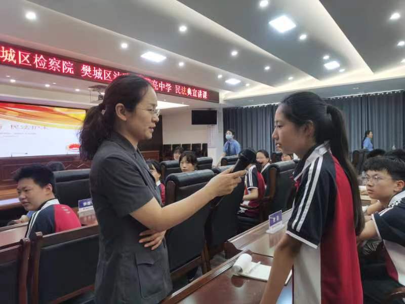 樊城区检察院徐迎黎检察官用生动的语言,结合真实案例,以及现场互动方式,深入浅出地揭开青少年自我保护的面纱,围绕在预防未成年人遭遇危险中应当如何做,怎样增强防范能力,提高未成年人的警惕性,鼓励同学们要勇于说不,用法律武器保护自己,避免受到身体上和精神上的双重伤害。