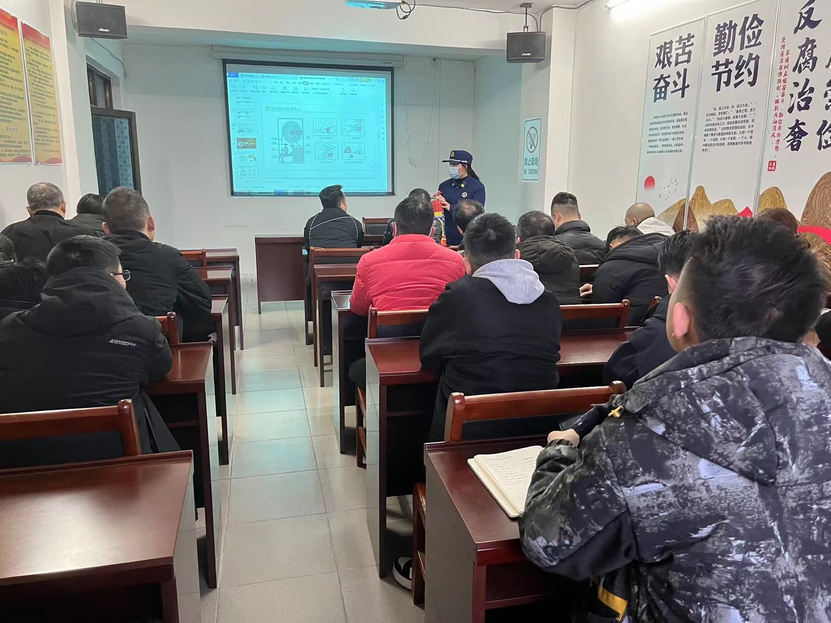 首先,宣讲员管教官介绍了近几年小区人员密集场所多发的火灾案例,并讲解了市场防火的几项注意事项,演示了灭火器、消防栓等消防设备的正确使用方法。