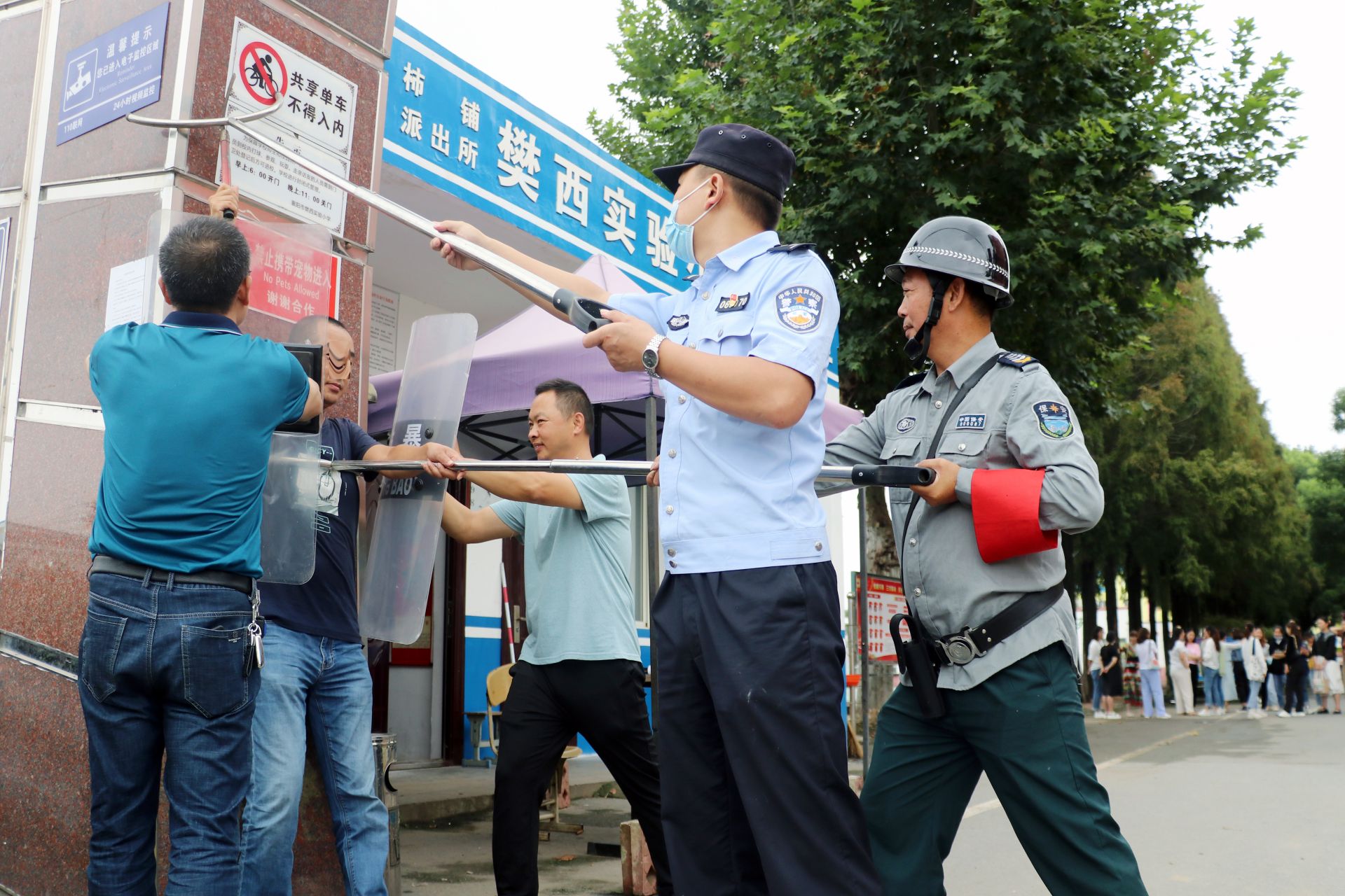 演练伊始,模拟场景惊心动魄:“不法分子”妄图闯入校园。危急时刻,保安迅速启动一键报警系统向派出所求救,并及时向校园安保负责人通报情况,随后手持装备,毅然决然地阻拦暴徒。校园最小应急单元成员闻警而动,奔赴校门口,途中指定专人开启校园警报,利用广播警示师生们迅速反应,撤回教室,紧闭门窗,整个校园进入高度戒备状态。