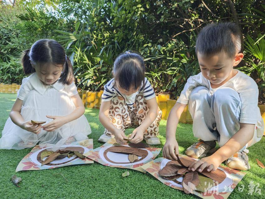 活动伊始,教师通过动画短片科普秋分知识,用“昼夜平分、天气转凉”的通俗讲解,让幼儿对节气形成初步认知。随后的“摸秋”游戏点燃热情,孩子们蒙眼触摸南瓜等秋作物,在猜测与验证中熟悉作物形态质感;“品秋”环节里,大家分享品尝橘子、枣子等时令水果,满是丰收的满足。“拾秋”创作环节中,孩子们用亲子共同收集的梧桐叶、栾树果实,拼贴出“小金鱼”“果实小树”等作品,承载亲子温情与对秋天的独特观察。