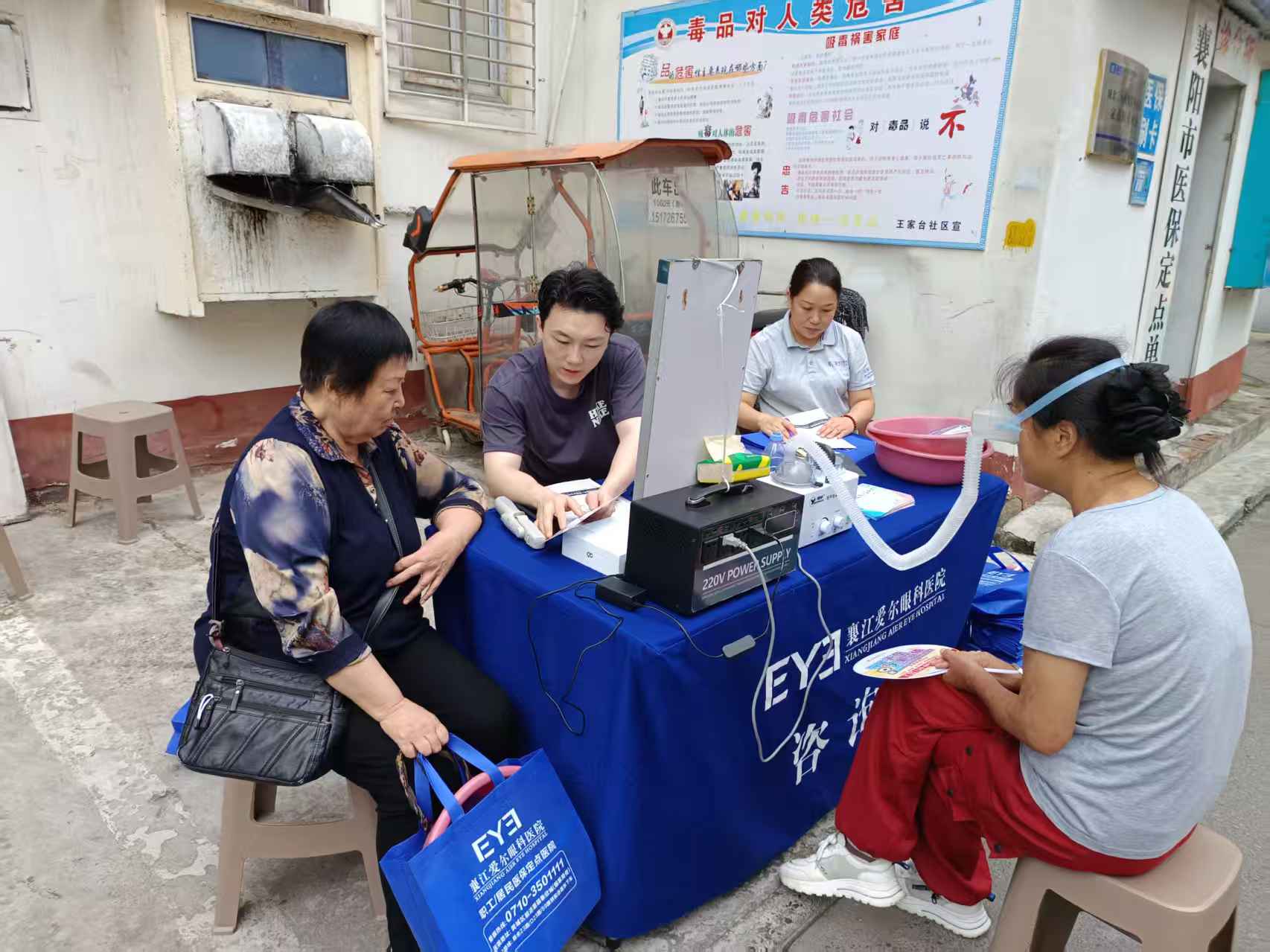 义诊现场,蓝色桌布铺就的服务台旁,医护人员身着白大褂忙碌不停:号尔口腔的医生仔细为居民检查牙齿,讲解龋齿预防、牙周护理等口腔保健知识;国大糖尿病管理中心的医护人员耐心测量血糖、血压,为慢性病患者叮嘱饮食与用药注意事项;襄江爱尔眼科的工作人员引导居民进行视力检测、眼底筛查,科普用眼卫生与护眼技巧。从银发老人到中年居民,大家闻讯而来,有序参与各项检查,在与医护人员的交流中增进健康认知,现场氛围热闹又温馨。