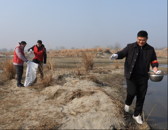活动现场,工作人员与志愿者身着志愿服装,分工协作、默契配合,小心翼翼地将粮食均匀撒投至水鸟活动区域,避免惊扰水鸟栖息觅食。