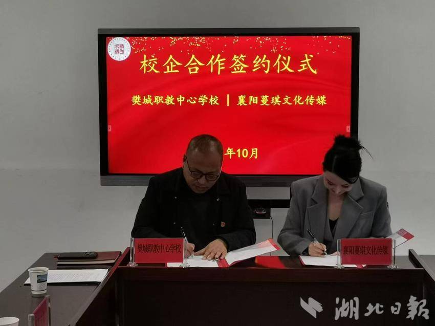 现场参观完毕,调研团一行在会议室进行了亲切座谈。樊城职教中心学校校长张红伟汇报了学校基本情况与校企合作成果。张校长重点提及,学校已与酷娱科技、万洲电气、周边汽车4S店等企业建立合作机制,今年还计划引入美容美甲、无人机操作、视频剪辑等技能选修课程,采用“企业导师驻校+教师现场助教”的双导师制度,培养符合区域产业需求的技能人才。调研团成员认真聆听汇报,就专业设置优化、实训资源扩容等问题展开交流,纷纷表示学校办学定位清晰,校企合作模式务实,为樊城区培养技能型人才提供了有力支撑。座谈会后,学校与襄阳蔓琪传媒举行了校企合作现场签约仪式,根据协议,双方将在酒店管理、人才培养等领域展开深入合作。