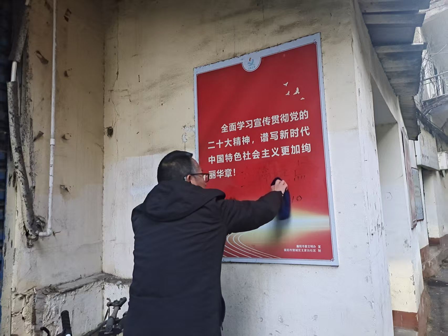 行动中,志愿者们手持喷壶、铲子、抹布等工具,深入背街小巷、居民楼院,对公共区域及墙体进行全面清理。面对顽固的“牛皮癣”,大家耐心铲除;针对蒙尘的公益广告牌,细心擦拭还原;对乱涂乱画的墙面,则使用专业清洁剂进行覆盖修复。对于部分破损严重、清理困难的公益广告,志愿者及时进行拆除并更新安装,确保宣传栏整洁美观。